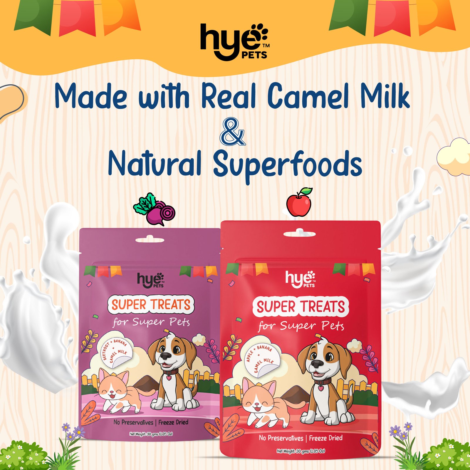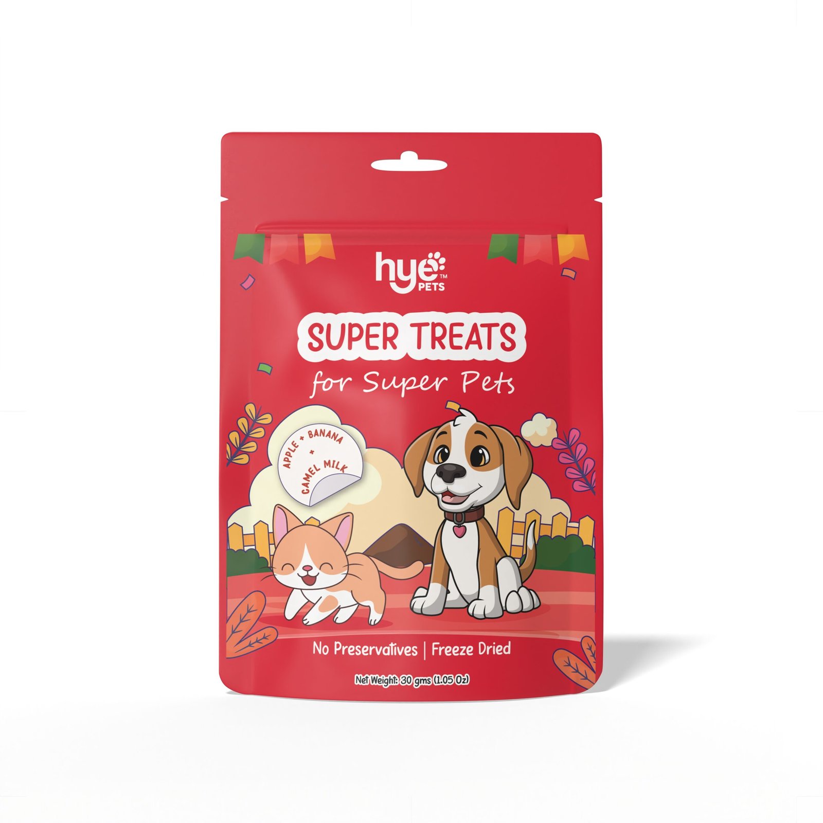 Treat your pets to HYE Pets Freeze-Dried Camel Milk Pet Treats made with Camel Milk, real Apple, and Banana. These crunchy bites are freeze-dried to lock in flavour and nutrition, with zero preservatives or additives.