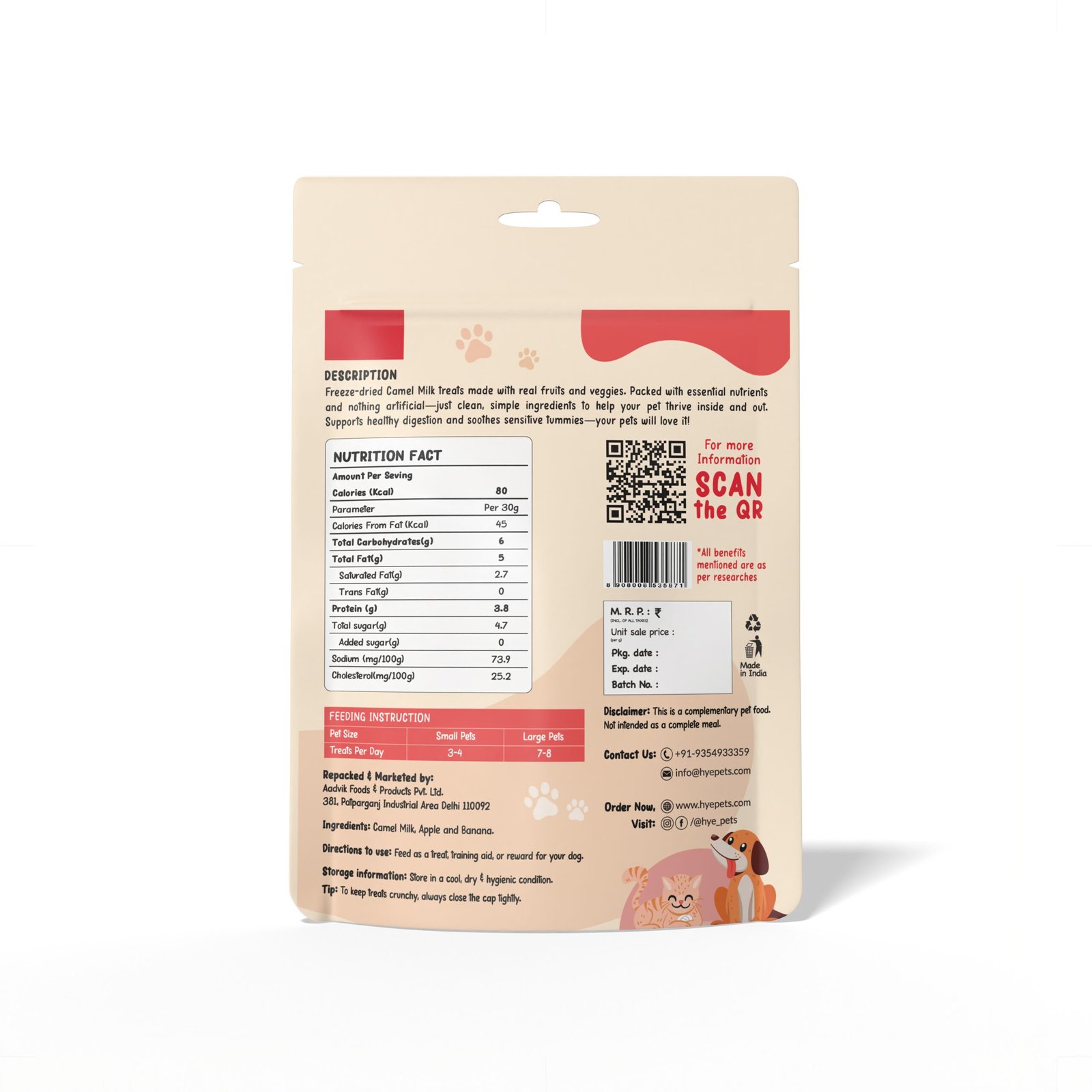 Camel Milk supports immunity and overall wellness, while Apple provides fibre for digestive health and Banana adds natural energy. A wholesome, everyday snack your pets will crave.